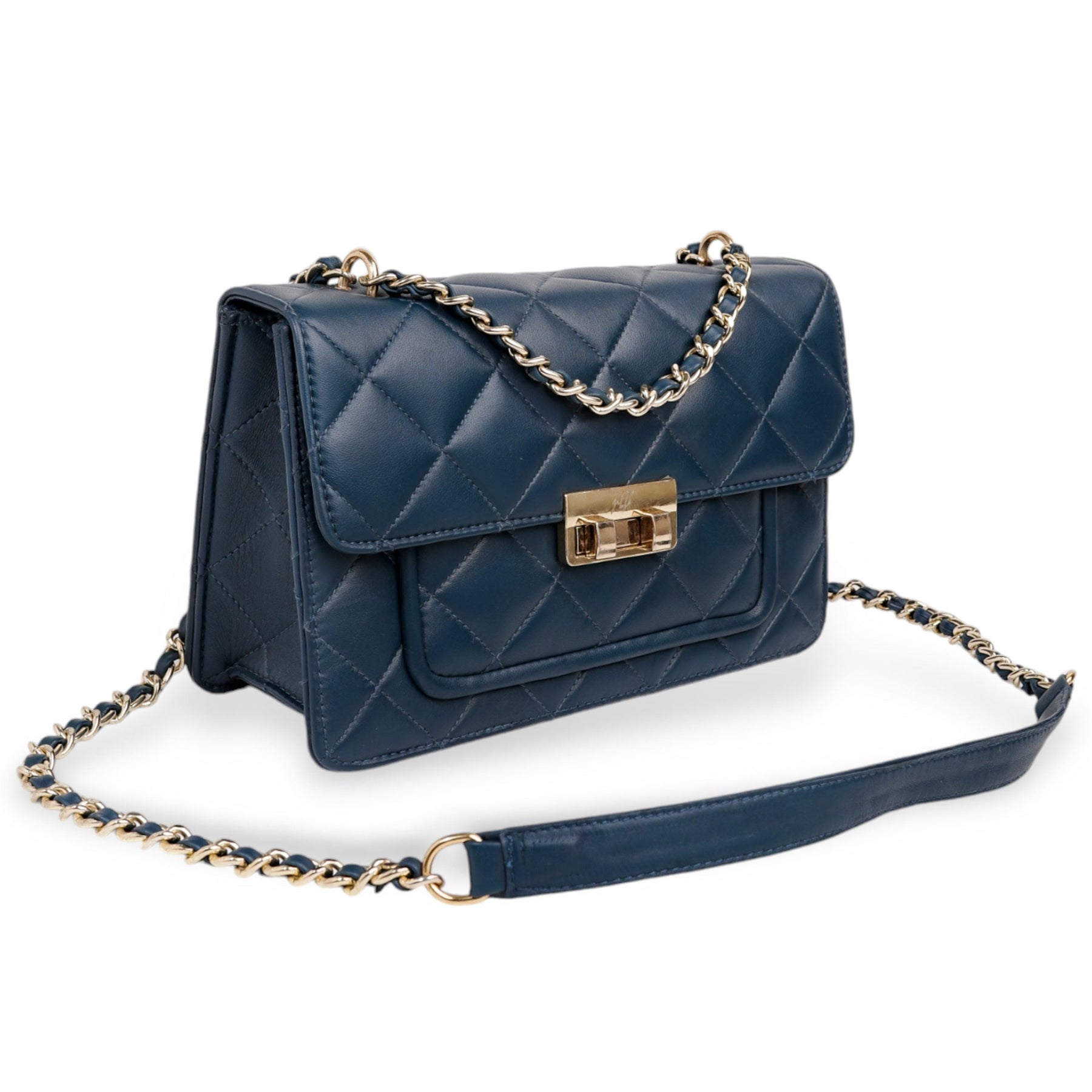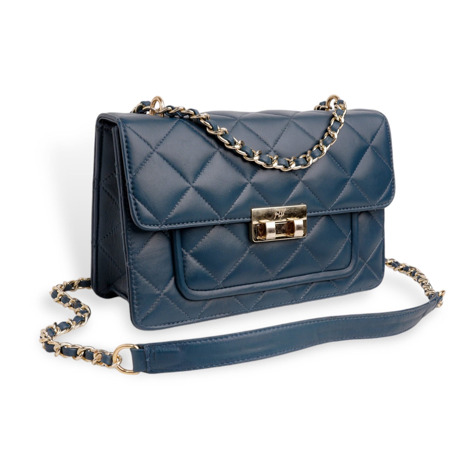 The Flora Quilted Crossbody Leather Bag in blue is a perfect mix of elegance and modern style. Made from premium genuine leather, it features a sophisticated quilted texture, adjustable strap, and secure magnetic closure. Compact yet roomy enough for daily essentials, this crossbody bag adds a refined touch to any outfit, whether for daytime errands or evening outings.